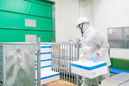 加工された製品は、きれいに梱包され、ボックスに入れて超低温冷蔵庫で保管されます。その後、出荷され、お客様の元へと運ばれていきます。