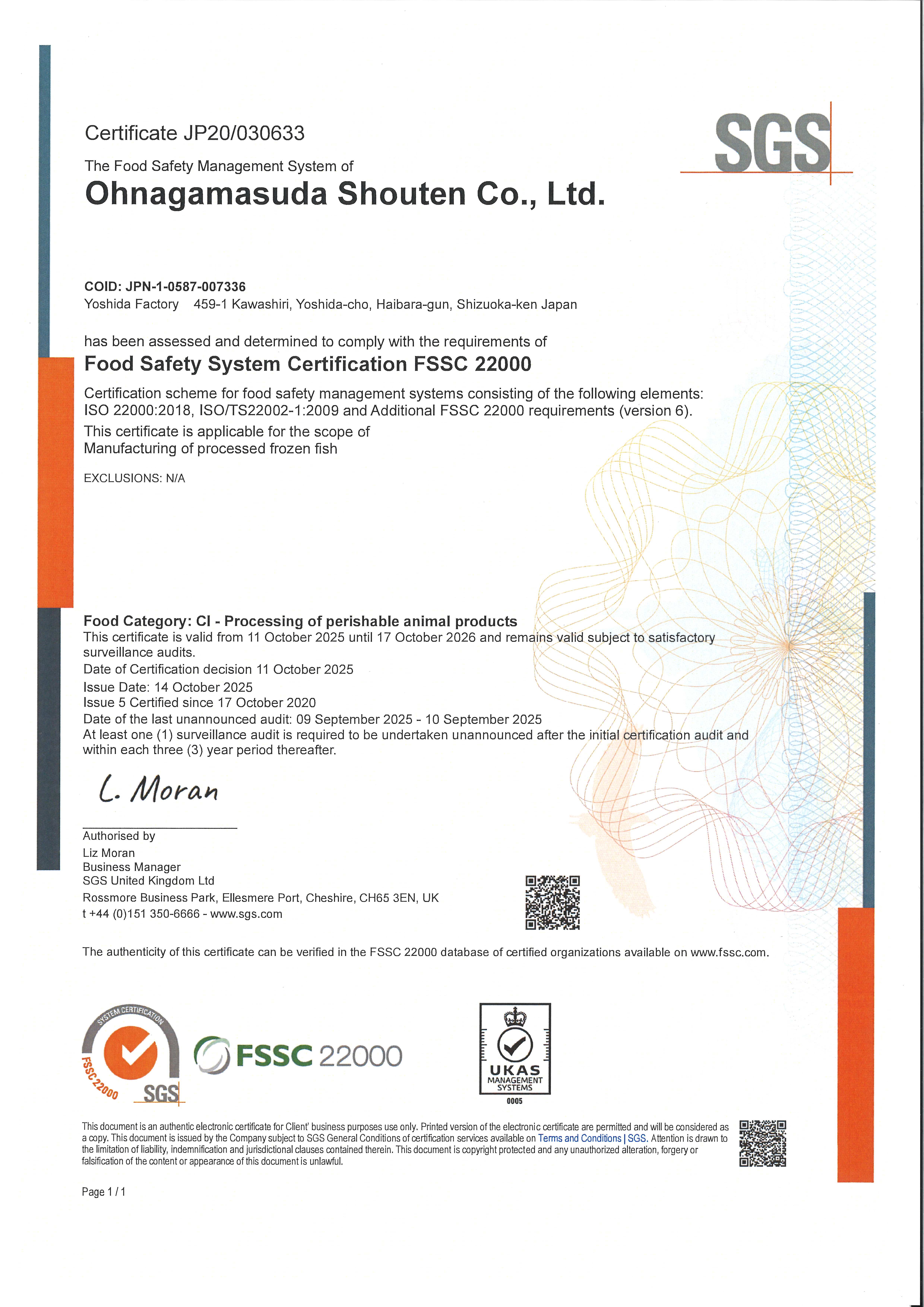 当社は、FSSC22000・ISO22000認証取得により、国内・海外市場において安全・安心な鮪・鰹の販売拡大に努めます。