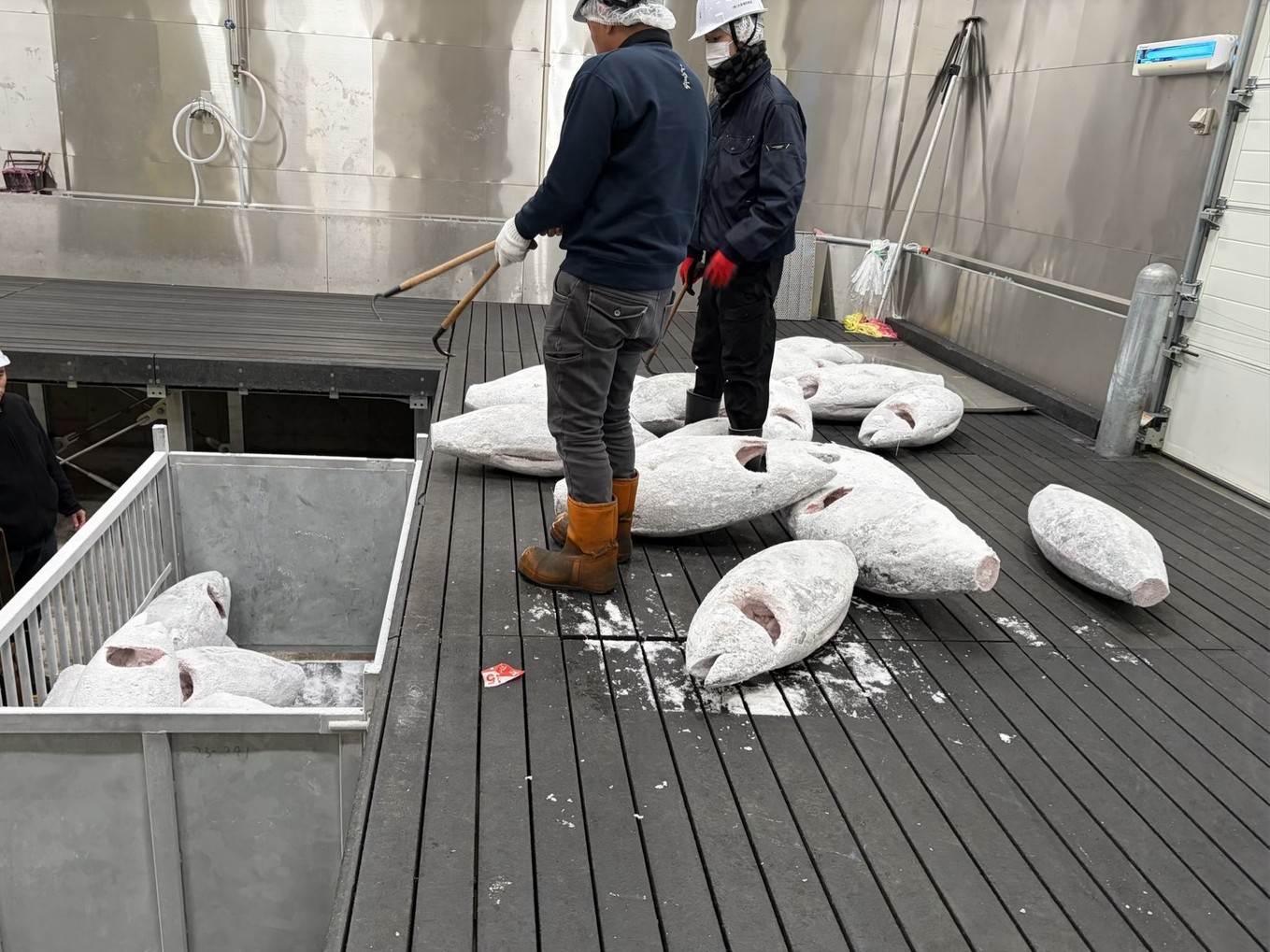 原料と製品の二つのパートに分けて行われました。手鉤(てかぎ)を刺して良い場所・刺し方、鮪の持ち上げ方、パレットへの詰め方。極力マグロの身を傷つけず、品質を落とさないための基本動作の徹底。製品を梱包する時の注意点、ロインやプレートといった形状別の繊細な扱い方、製品価値を維持する意識。ここまで細かく学ぶ理由は、冷凍鮪が非常に傷つきやすく、手鉤のミスやちょっとした衝撃がそのまま私たちが守るべき「信頼」に直結するからです。