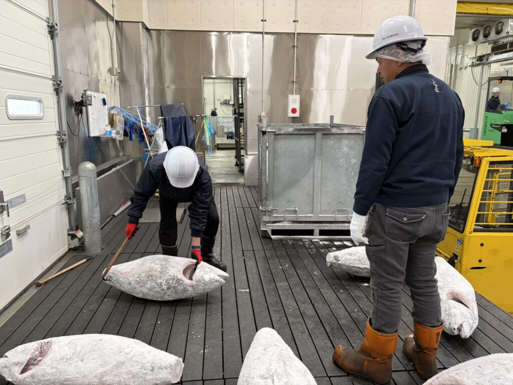 残念ながら、私は持ち上げ方に変なクセがあるようで、鮪を抱えた瞬間、腰が悲鳴を上げました。どうやら鮪を扱うセンスが無いようです。この経験を通じて、当社の新入社員がこれからどれだけ重要な、そして力が必要な仕事に就くのかを改めて肌で感じることができました。この研修で学んだ鮪へのリスペクトを胸に、社員一同、お客様に最高の品質をお届けできるよう、元気に頑張ってまいります!