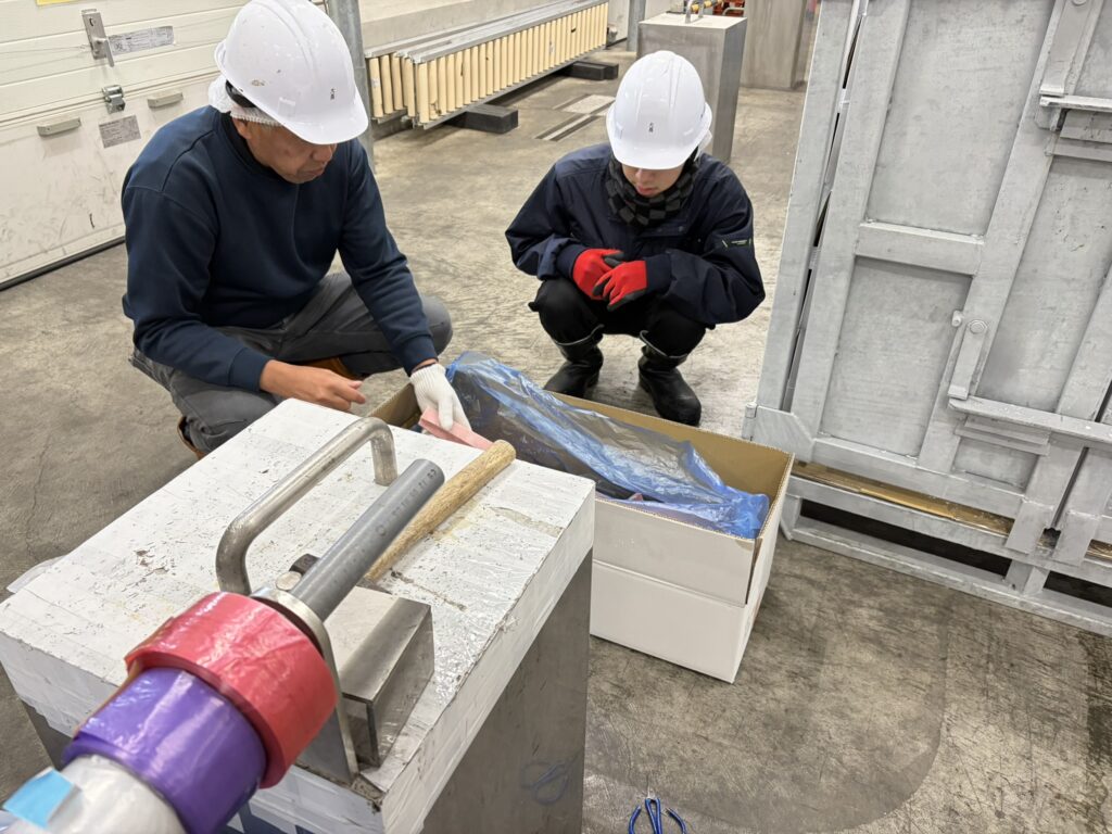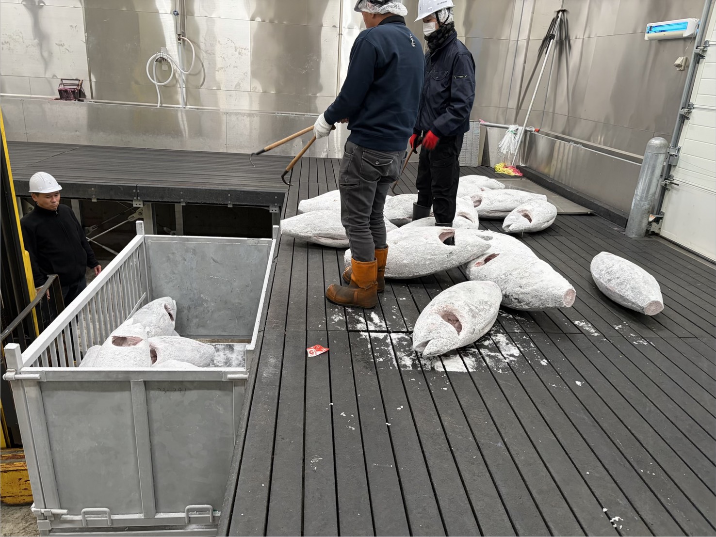 原料と製品の二つのパートに分けて行われました。手鉤(てかぎ)を刺して良い場所・刺し方、鮪の持ち上げ方、パレットへの詰め方。極力マグロの身を傷つけず、品質を落とさないための基本動作の徹底。製品を梱包する時の注意点、ロインやプレートといった形状別の繊細な扱い方、製品価値を維持する意識。ここまで細かく学ぶ理由は、冷凍鮪が非常に傷つきやすく、手鉤のミスやちょっとした衝撃がそのまま私たちが守るべき「信頼」に直結するからです。