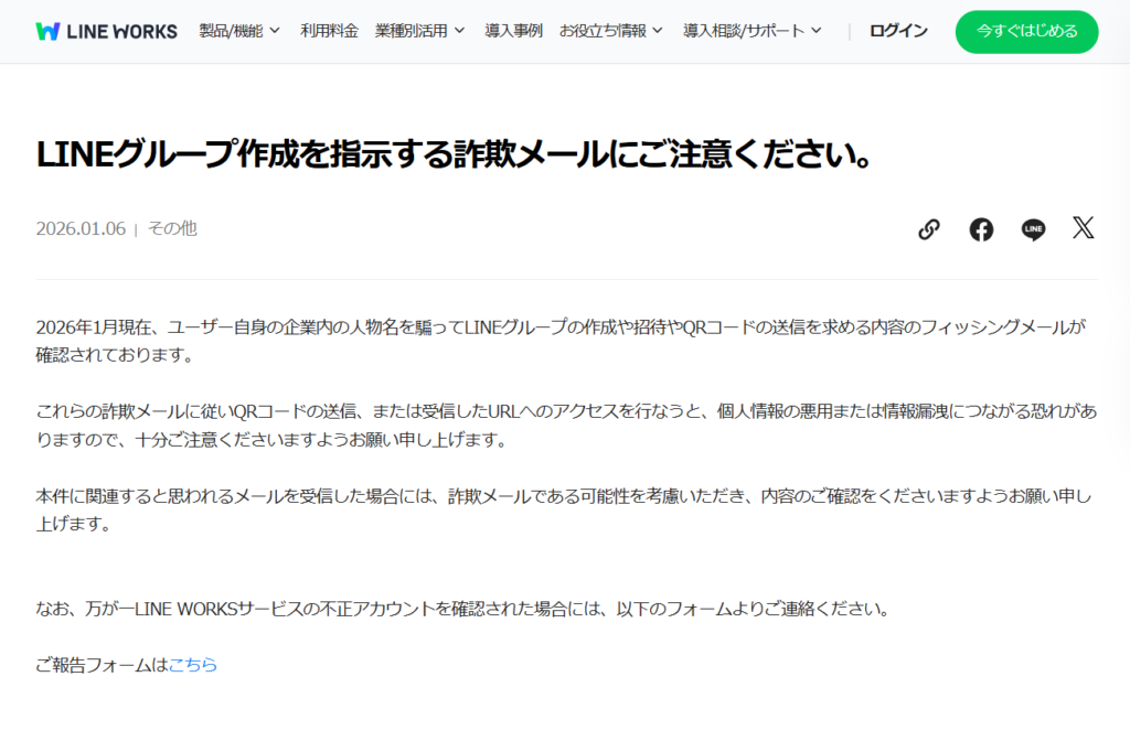 ↓LINE WORKS株式会社様の注意喚起文章